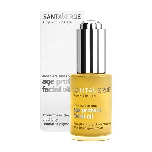 Олія абрикосових кісточок, олія оливи, олія сафлору фарбуючого, сік листя алое віра, ізоаміл лаурат, олія жожоба, олія примули вечірньої, арганова олія, екстракт квітів алое віра, запашна речовина (аромат), етиловий спирт, гліцерин, екстракт кореня астрагалу перетинчастого, екстракт кореня атрактилодеса, екстракт кореня володушки, олія насіння соняшника, екстракт кори чорної верби, токоферол (вітамін Е), левулінова кислота, левулінат цитраль, цитронеллол, лимонен, ліналоол, гераніол, кумарин. Без барвників, синтетичних ароматів, агресивних консервантів. аргани, примули вечірньої, кісточок абрикоса, сафлора красильного і жожоба, що входять до складу рослинної олії, посилюють захисні функції шкіри, підвищують її еластичність і розгладжують зморшки.Багаті антиоксидантами екстракти квітів алое віра та пелюсток ладанника оберігають шкіру від шкідливого впливу вільних радикалів. Екстракти кореня астрагалу, володушки та атрактилодеса запобігають гіперпігментації та вирівнюють колір обличчя. Натуральна олія Santaverde Age Protect Facial Oil швидко вбирається, роблячи шкіру м'якою та шовковистою. Підходить для всіх типів шкіри, особливо для зневодненої, сухої та чутливої.