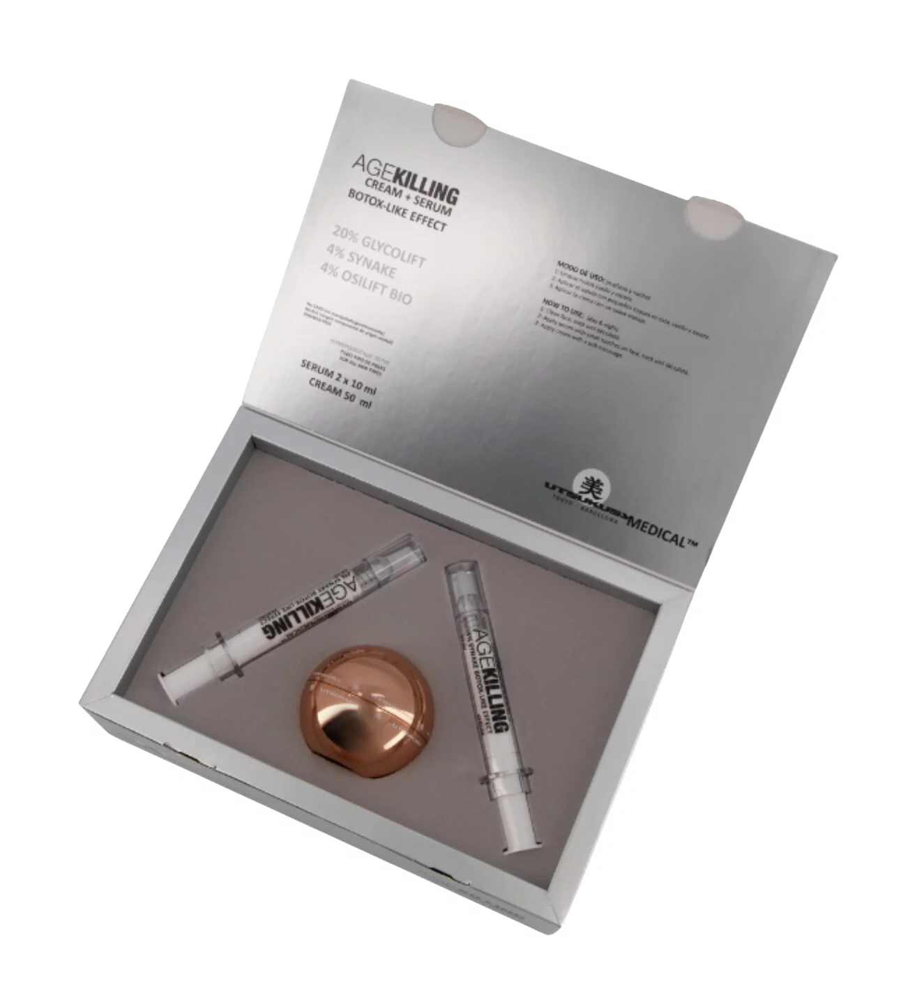 Подарунковий набір UTSUKUSY AgeKilling Homecare Set — інтенсивна антивікова програма для щоденного догляду, натхненна ефектом ботулінотерапії, але без ін'єкцій. Цей набір створено для тих, хто хоче ефективно боротися зі зморшками, втратою пружності та ознаками втоми шкіри, не вдаючись до агресивних методів. AgeKilling Homecare Set забезпечує видиме розгладження мімічних та вікових зморщок, глибоке зволоження та виражений ліфтинг-ефект. Засоби у складі набору спрямовано впливають на зони з найбільшою концентрацією зморщок (лоб, носогубна складка, шия), пом'якшуючи вираженість ліній та запобігаючи їх подальшій появі. Формули розроблені з урахуванням потреб усіх типів шкіри.