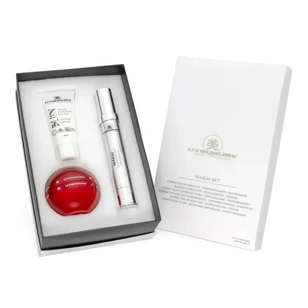 UTSUKUSY Wakai Set — це комплексний догляд, спрямований на вирівнювання тону, боротьбу з ознаками старіння та відновлення сяйва шкіри. Формули продуктів створені з використанням інноваційних компонентів, що сприяють зменшенню пігментації, підвищенню пружності шкіри та її глибокому зволоженню.