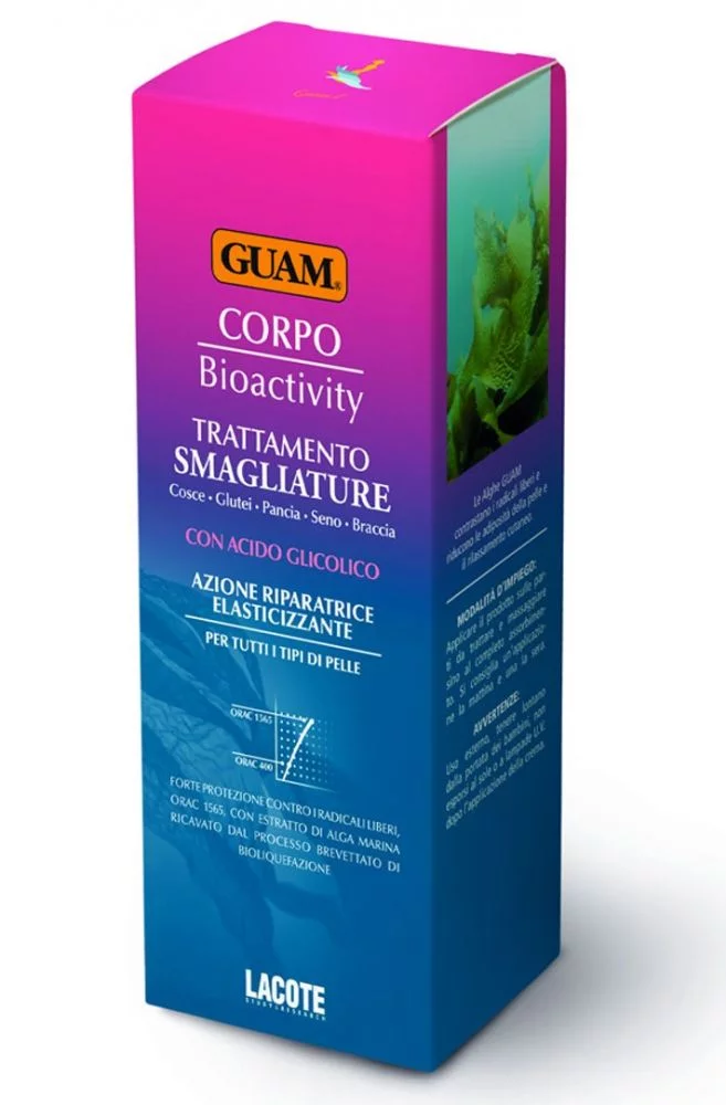 Активні компоненти: Водорості Guam борються з дією вільних радикалів,протистоять втраті еластичності шкіри. Гідрогліколевий екстракт бурої водорості Gelidium sesquipedale містить мінерали, олігоелементи та амінокислоти, покращує рівень зволоженості, живить та відновлює шкіру, покращує її еластичність. Гліколева кислота (альфа – гідроксикислоти, АНА) сприяє відновленню гладкості шкіри, зменшенню та освітленню вже існуючих на шкірі розтяжок, стимулює синтез колагену.