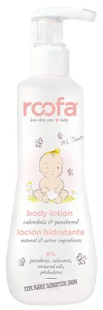 Щоб забезпечити не тільки ефективність, а й нешкідливість косметики Roofa, фахівці цього бренду розробляють гіпоалергенні формули, що базуються на термальній воді та натуральних компонентах. Прикладом такого ніжного засобу виступає легкий лосьйон з пантенолом та екстрактом календули, який делікатно відновлює та заспокоює епідерміс малюка.