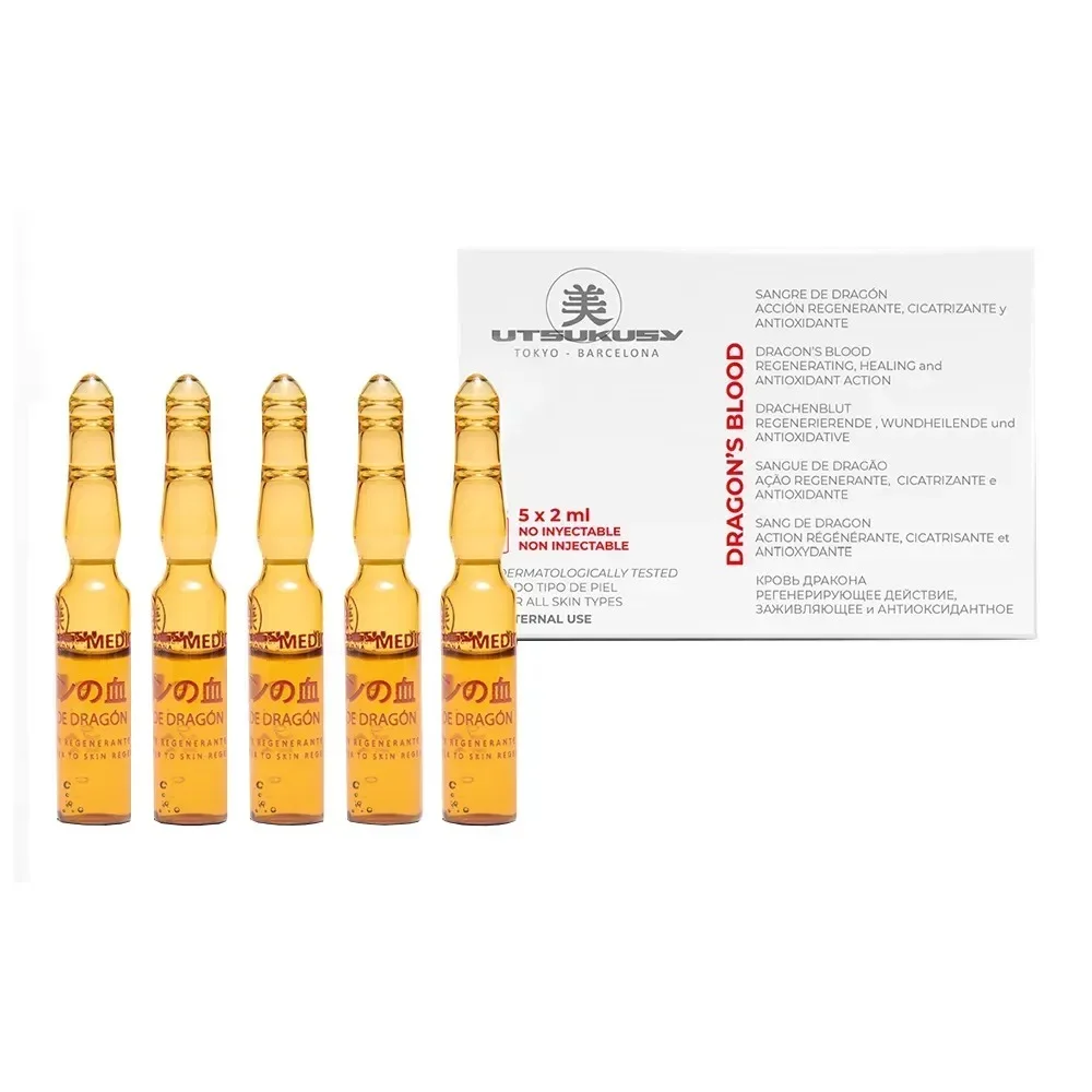 Сироватка Utsukusy Dragon's Blood — ефективний засіб для інтенсивного догляду за шкірою обличчя. Вона стимулює процес загоєння, сприяє стягуванню ран і регенерації шкіри, а також посилює вироблення колагену. Представлена у вигляді ампул з активними інгредієнтами, сироватка Dragon's Blood особливо рекомендується після апаратних процедур для обличчя, при наявності плям або шрамів, коли шкіра виглядає тьмяною і безжиттєвою, а також для боротьби зі зморшками, в тому числі мімічними. Дія сироватки спрямована на захист і зміцнення колагенових волокон, заповнення зморщок, регенерацію шкіри після інтенсивного догляду і протидію впливу вільних радикалів. Важливо зазначити, що ампули з активними інгредієнтами створені виключно для зовнішнього застосування і не підходять для ін'єкцій.