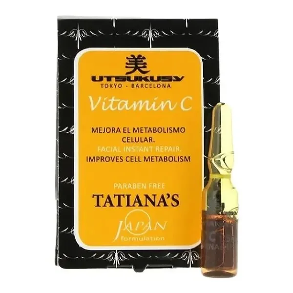 Utsukusy Tatiana's Vitamin C — ампульна сироватка-регенератор з швидкодіючим ефектом, що сприяє покращенню клітинного метаболізму. Концентрована формула сироватки має виражену омолоджувальну та відновлювальну дію, а також ефект філера, спрямований на боротьбу зі зморшками. Засіб сприяє швидкому відновленню шкіри, допомагаючи усунути ознаки втоми та розгладити зморшки, а також вирівняти тон і колір обличчя. Сироватка працює на підвищення щільності та пружності шкіри, стимулюючи вироблення колагену. Продукт може бути рекомендований для різних типів шкіри, особливо для шкіри з ознаками втоми, токсичного навантаження, постакне, а також при зниженні пружності та еластичності, тьмяному кольорі обличчя.