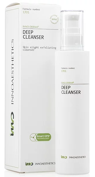 Innoaesthetics Inno-Derma Deep Cleanser дбайливо взаємодіє з чутливим епідермісом, заспокоюючи роздратовані ділянки. Активні компоненти вирівнюють товщину ороговілого шару епідермісу, стимулюють регенерацію, внутрішньоклітинний обмін і контролюють природну кератинізацію. Інгредієнти пом'якшують огрубілі місця, дарують шкірі гладкість, ніжність, бархатистість та сяйво. Продукт підійде не тільки для професійного використання, а й для щоденного догляду за жирною та комбінованою шкірою.
