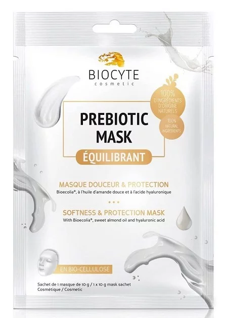 Маска Biocyte Prebiotic Mask з мигдальним маслом та гіалуроновою кислотою допомагає запобігти сухості шкіри та розгладжує її. Допомагає збалансувати мікробіоту шкіри, одночасно захищаючи та зволожуючи її завдяки синергетичній дії активних інгредієнтів. Шкіра захищена та м'якша. Його основа з натуральних волокон біоцелюлози забезпечує ефект другої шкіри, який забезпечує оптимальне прилягання маски і в 10 разів перевершує ефективність звичайних масок. Мигдальне масло відновлює суху, пошкоджену шкіру, очищає її поверхню від бактерій. Також вона робить шкіру пружною, знімає подразнення. Гіалуронова кислота інтенсивно зволожує та пом'якшує тканини, запобігає випаровуванню вологи з клітин та захищає від агресивного впливу зовнішніх факторів.