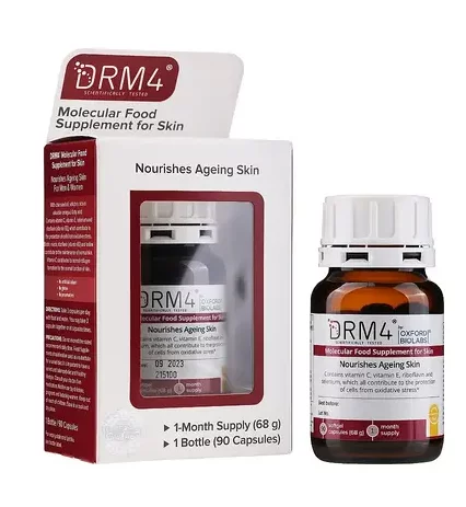 Молекулярна дієтична добавка для поліпшення стану шкіри, живлення шкіри Oxford Biolabs DRM4 Food Supplement for Skin — до, омебінація високої концентрації омега-3/омега-6 жирних кислот, ключових компонентів і мікроелементів, потужних антиоксидантів, екстракту чорниці та корисних поліфенолів створюють унікальну формулу, яка збереже молодість шкіри.