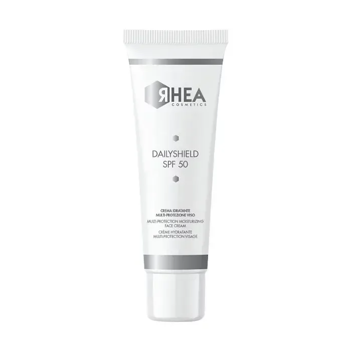 Мультизахисний зволожувальний сонцезахисний крем для обличчя Rhea Cosmetics DailyShield Multi-protection Moisturizing Face Sunscreen SPF 50 захищає шкіру від негативного впливу зовнішніх факторів та УФ-променів. Зміцнює захисний бар'єр, уповільнює процеси старіння, зменшує подразнення. Освітлює, регенерує, надає антиоксидантну дію. Вирівнює тон, надає здоровий вигляд.