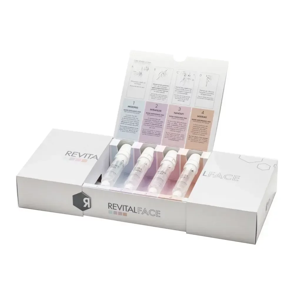 MicroPeel, IntraFiller, NanoLift і LaserLike, всього 2 місяці лікування. Після очищення шкіри двічі натисніть на дозатор флакона (еквівалентно 1 мл продукту) і наносьте один раз на день ввечері. RevitalFace можна використовувати окремо або, для більшого комфорту, наносити під крем для обличчя з Rhea B-Dose.