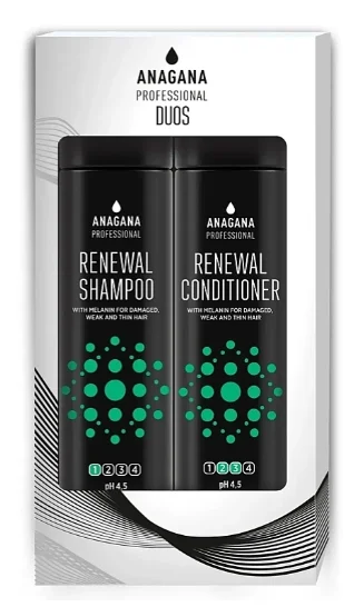 Набір «Відновлення» для пошкодженого волосся Anagana Professional Renewal Duos — це інтенсивний живильний та оновлювальний комплекс б’юті-засобів. Він поєднує шампунь і кондиціонер однієї лінійки Renewal. В синергії ці продукти здатні повернути пасмам здоровий та свіжий вигляд. Дію цих засобів доречно підсилювати маскою, двофазним кондиціонером та флюїдом від Anagana.