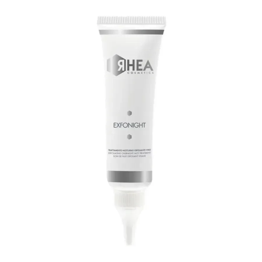 Нічний відновлювальний догляд Rhea ExfoNight — гелева емульсія з ефектом другої шкіри, яка м'яко відлущує, оновлює та регенерує дерму. Маска очищає шкіру, запобігає закупорці пор і появі чорних цяток, не дає утворюватися запаленням. У складі маски АНА і PHA кислоти, які сприяють регенерації.
