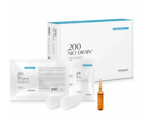 Подготовка. Поместите два пакетика 201 Nio Active и 203 Nio Aquadrain в миску с горячей водой на 2 минуты. Тем временем, рекомендуется подготовить клиента к сеансу, выполнив механический сухой пилинг ног, живота и спины щеткой для тела Arosha. Распылите 106 Glycolic Acid на участок, который нужно обработать. Оставьте действовать на 4 минуты и удалите остатки влажной салфеткой.