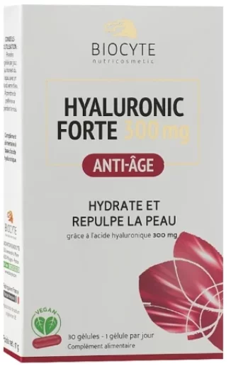 Biocyte HYALURONIC FORTE 300MG — это пищевая добавка, действие которой против морщин и увлажнения кожи научно доказано. Многочисленные внешние воздействия, которым подвергается наша кожа, способствуют ее преждевременному старению, сухости кожи и образованию морщин. HYALURONIC FORTE 300MG увлажняет кожу и повышает эластичность кожи, обеспечивая быстрое омолаживающее действие. Кожа находится в постоянном взаимодействии с окружающей средой. Загрязнение окружающей среды, курение, смена времени года, недостаток сна или даже стресс – источники агрессии для нашей кожи. Тем не менее, воздействие солнца остается основным фактором старения кожи и является причиной 90% морщин и преждевременного старения кожи. Постепенное изменение естественной гидролипидной пленки кожи вызывает ее расслабление и образование морщин. Гиалуроновая кислота — это молекула, которая выполняет функцию увлажнения и защиты кожи от внешних воздействий. Благодаря своей способности удерживать воду, он заполняет пространство между клетками кожи и способствует ее регенерации, придавая ей гладкость и мягкость. Таким образом, использование гиалуроновой кислоты обеспечивает непрерывное увлажнение кожи в течение дня. Гиалуроновая кислота считается «цементом кожи», потому что она заполняет сетку между волокнами эластина и коллагена, придавая коже увлажненный и подтянутый вид.