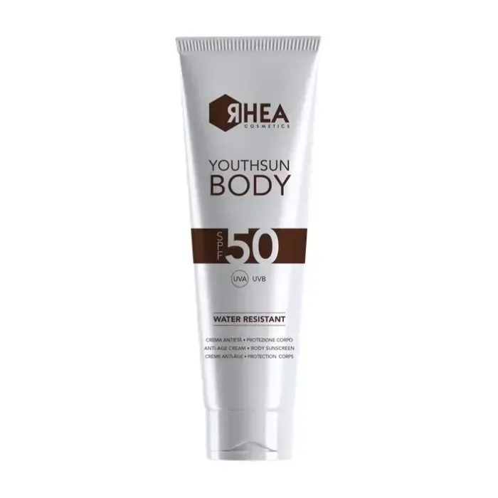 Солнцезащитный антивозрастной крем для тела Rhea Cosmetics YouthSun Anti-Age Cream Body Sunscreen SPF 50 защищает от вредного воздействия УФ-лучей. Придаёт упругость и эластичность. Оказывает антиоксидантное действие, замедляет процессы старения, стимулирует выработку коллагена и эластина. Мягкая текстура комфортно ложится на кожу, не оставляя липкости и неприятных ощущений.