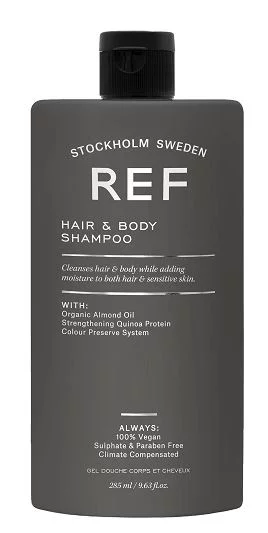 REF Hair & Body Shampoo – це інноваційний продукт, створений для одночасного очищення волосся та тіла, який забезпечує максимальну свіжість та зволоження.