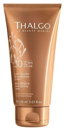 Thalgo Sun Lotion SPF30 – лосьйон для тіла, що омолоджує, який не тільки перешкоджає фотоушкодженням клітин, але і підвищує еластичність шкіри, бореться з запаленнями, покращує гідробаланс. Такий приголомшливий комплексний вплив Thalgo Age Defence Lotion SPF 30 забезпечується за рахунок високоефективних інгредієнтів морського та рослинного походження.